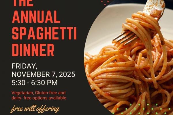 Join us Friday evening, November 7 at 5:30 PM for our annual spaghetti dinner! We’ll be serving spaghetti with a variety of sauces: marinara (vegan/vegetarian), marinara with meat (gluten- and dairy-free), and marinara with meatballs. Gluten-free spaghetti will be available. We will also have salad, garlic bread, and dessert. The...